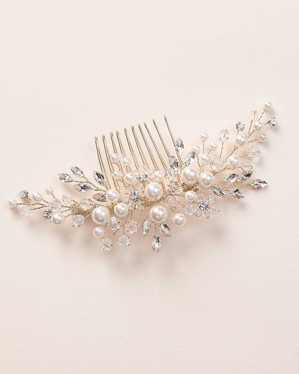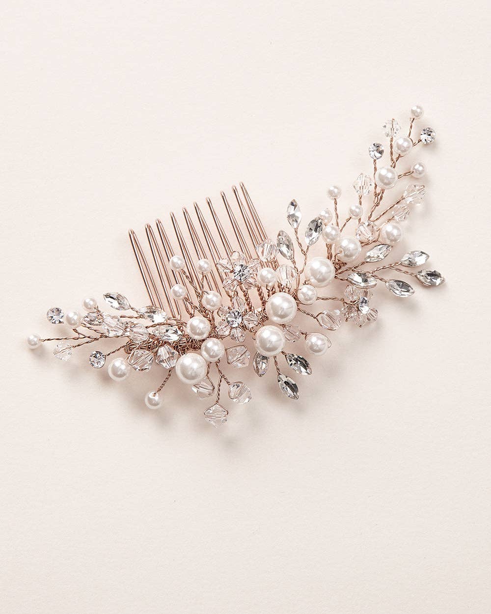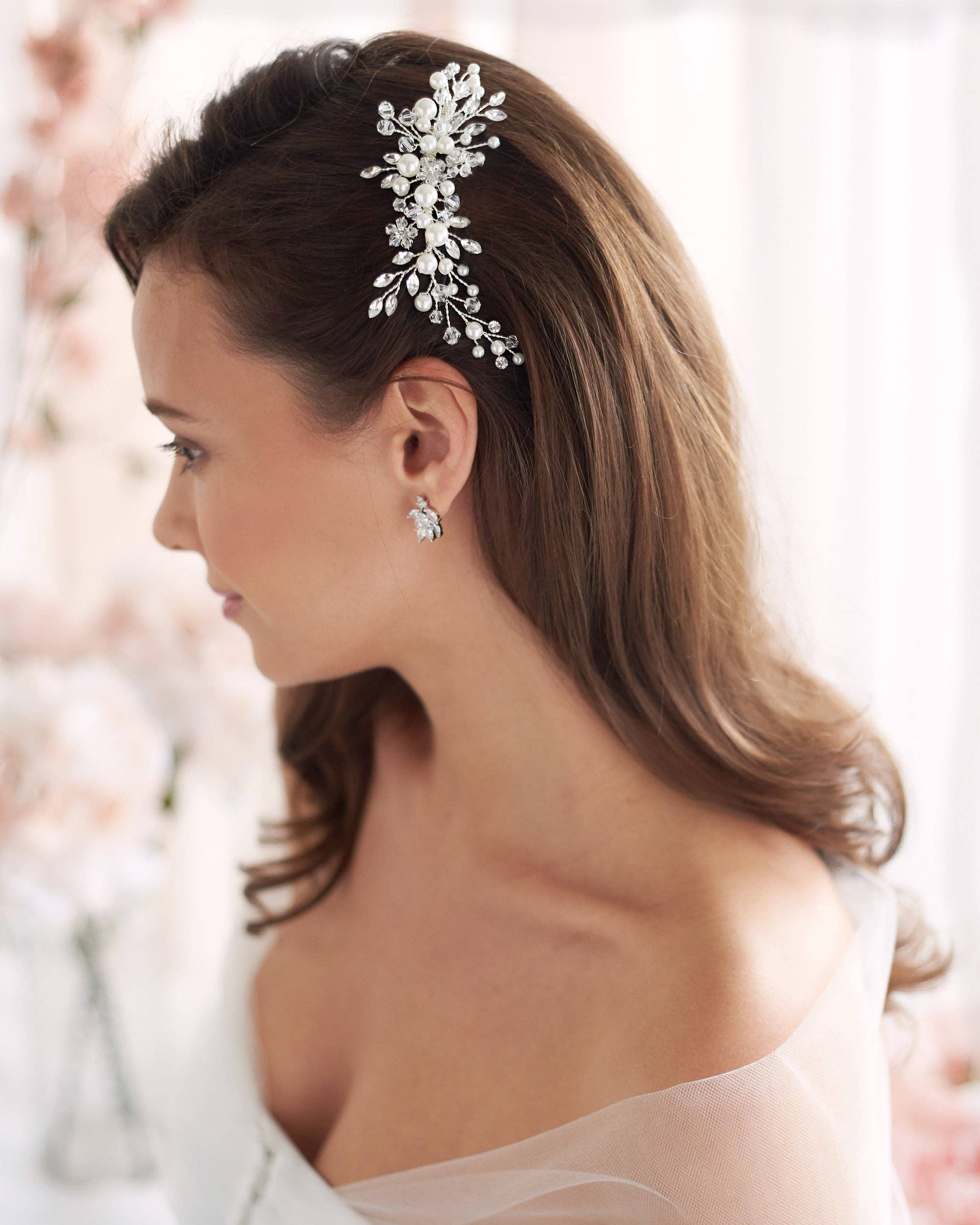 One of our most popular bridal hair combs, Emmy is classically designed with hand wired branches of off-white pearls & crystals that sparkle from all angles. Lightweight & easy to style.